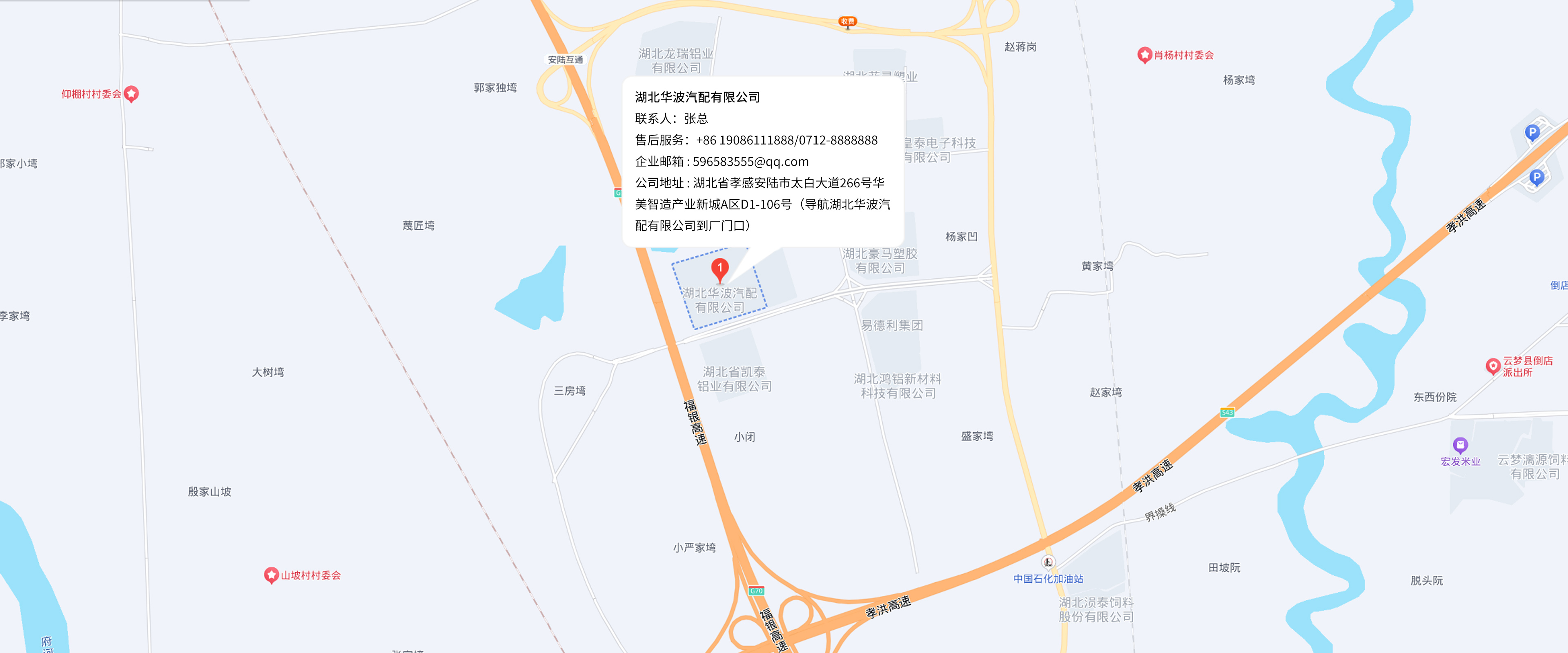 公司地址:湖北省孝感安陆市太白大道266号华美智造产业新城A区D1-106号(导航湖北华波汽配有限公司到厂门口)